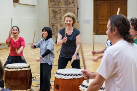 The drums are made of cow skin and heavy, hard carved wood. They’re played with thick sticks and the impact is impressive. Training on the drums follows, as closely as possible, in the style of my Japanese teacher, Tamada-san: warm-up, strike exercises and then pieces.